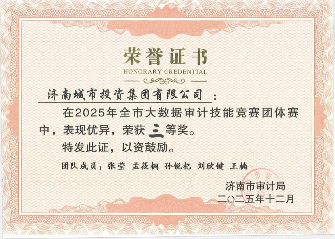 近日,濟(jì)南市審計局舉辦2025年全市大數(shù)據(jù)審計技能競賽決賽,濟(jì)南城投集團(tuán)榮獲團(tuán)隊賽三等獎。