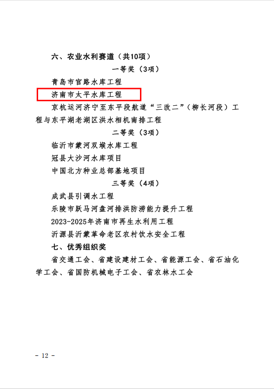近日,由山東省總工會(huì)、山東省發(fā)展和改革委員會(huì)、山東省工業(yè)和信息化廳等8個(gè)單位聯(lián)合開展的2025年“魯興杯”勞動(dòng)競(jìng)賽決賽獲獎(jiǎng)名單正式公布,濟(jì)南城市投資集團(tuán)有限公司承建的濟(jì)南市太平水庫(kù)工程憑借在質(zhì)量管控、智能創(chuàng)新、高效推進(jìn)等方面的突出表現(xiàn),榮獲農(nóng)業(yè)水利賽道一等獎(jiǎng),成為全省水利工程建設(shè)的標(biāo)桿典范。