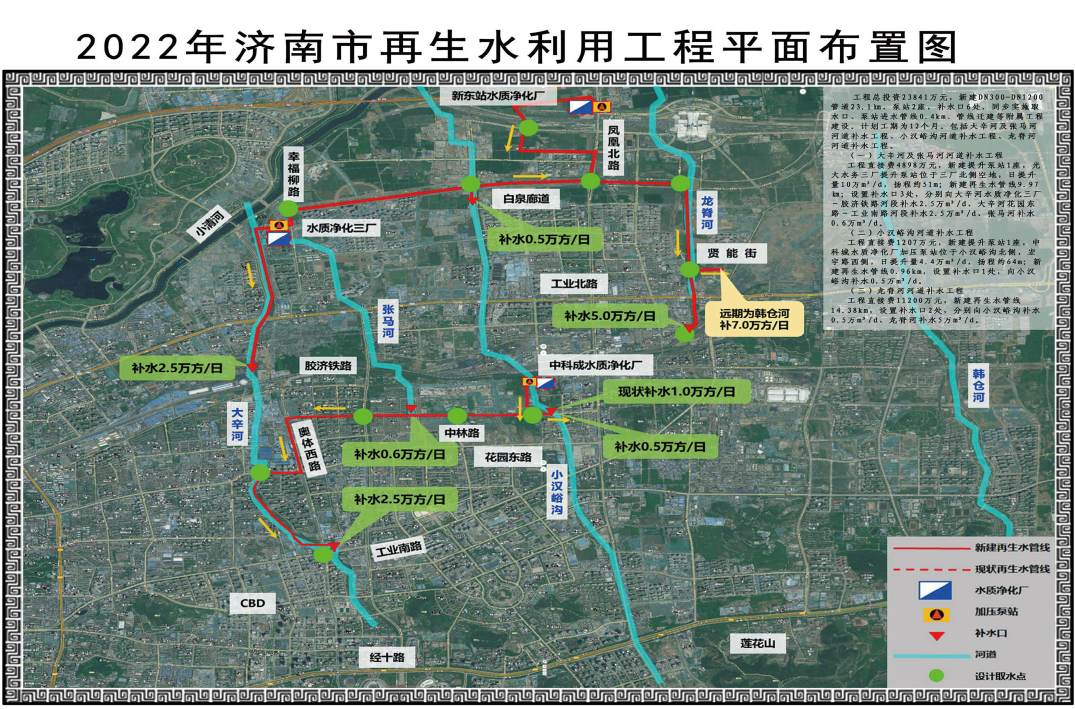 濟(jì)南市2022年再生水利用工程是一項(xiàng)防河道生態(tài)污染、保護(hù)河道生態(tài)環(huán)境的綜合治理工程,通過(guò)泵站加壓將水輸送到大辛河、張馬河、小漢峪溝和龍脊河河道上游,保證河道生態(tài)基流,實(shí)現(xiàn)河道水體良性循環(huán),達(dá)到改善河道水質(zhì)的效果,進(jìn)一步提高河道周邊居民生活的幸福感,同時(shí)滿足沿線市政雜用用水。