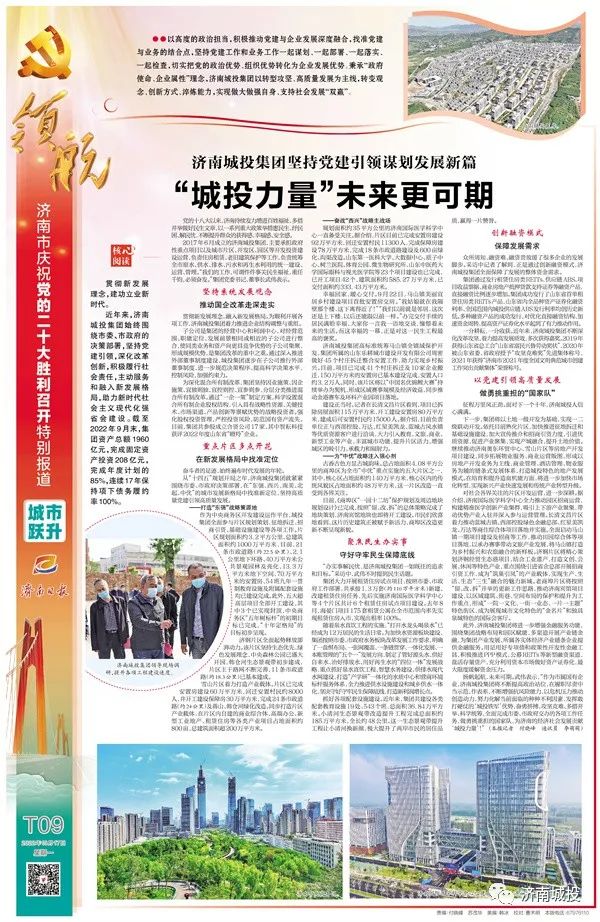 近年來,濟(jì)南城投集團(tuán)始終圍繞市委、市政府的決策部署,堅持黨建引領(lǐng),深化改革創(chuàng)新,積極履行社會責(zé)任,主動服務(wù)和融入新發(fā)展格局,助力新時代社會主義現(xiàn)代化強(qiáng)省會建設(shè)。截至2022年9月末,集團(tuán)資產(chǎn)總額1960億元,完成固定資產(chǎn)投資208億元,完成年度計劃的85%,連續(xù)17年保持項下債務(wù)履約率100%。