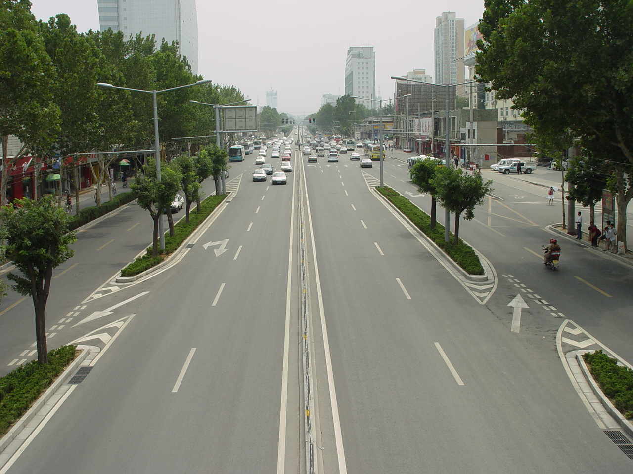 解放路地處濟南市中心,兩側(cè)人口密度大、商鋪林立、交通流量大,是一條城市主干道,青龍橋路口、解放路口、山大路口等幾個大路口是整個濟南市的交通樞紐。該工程西起青龍橋,東至二環(huán)東路,全長3550米,道路紅線歷山路以西45米,歷山路以東50米,兩側(cè)為7.5米寬公交專用車道,自行車和人行道一體化設計。解放路工程于2005年5月25日正式封閉施工,僅用一個月的時間就實現(xiàn)了快車道的通車任務,創(chuàng)造了濟南市政道路工程的一個奇跡。2005年9月18日,由建設部組成的專家組對解放路工程的橋梁和道路工程檢查后給出了“建設程序完備、施工資料齊全、工程質(zhì)量優(yōu)良”的評價。2005年10月解放路全面通車,確保了全國糖酒博覽會的順利召開。